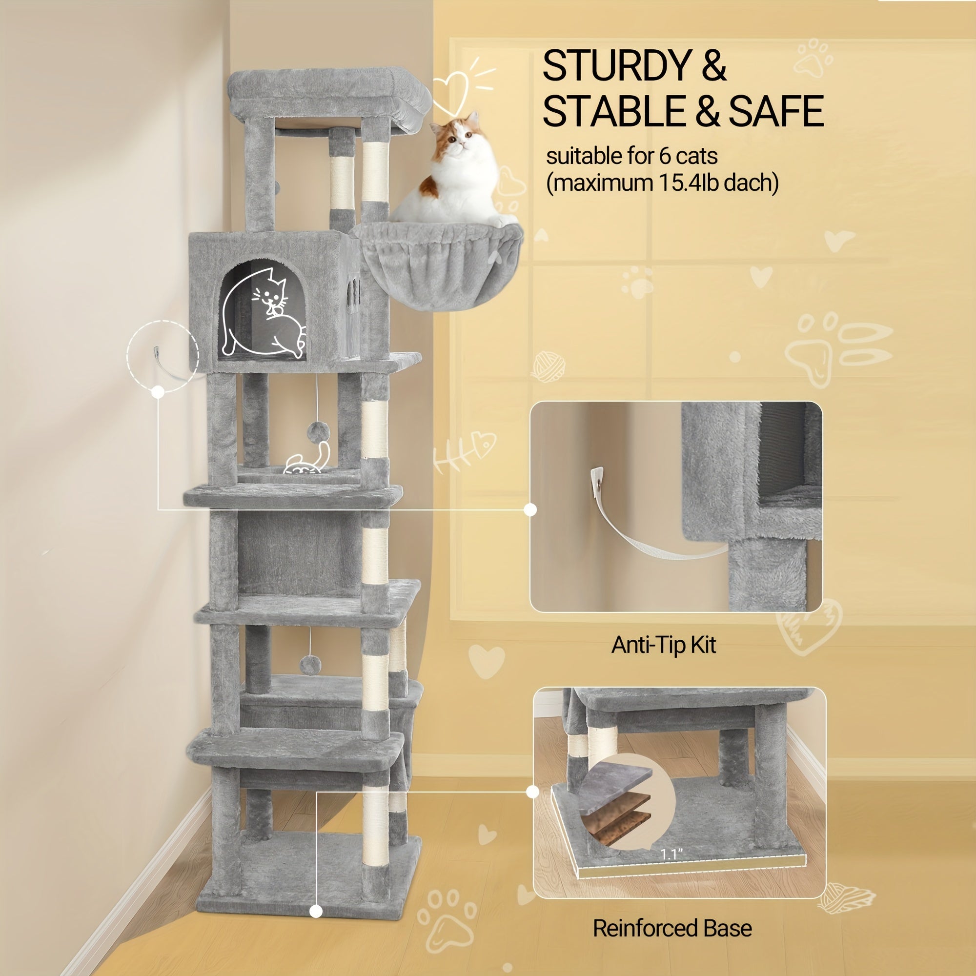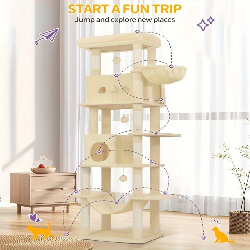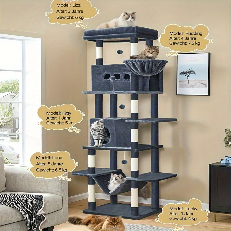 This premium cat tower stands at an impressive 210 cm, engineered specifically for Maine Coons and larger cat breeds. The structure features 10 strategically positioned scratching posts to satisfy natural instincts while protecting your furniture, complemented by 2 spacious caves for secure retreats and 2 suspended hammocks for elevated lounging. A generous platform provides ample space for stretching and observation, while the included washable mat ensures easy maintenance. The multi-level design accommodates multiple cats simultaneously, and the heavy-duty construction guarantees stability and durability. This comprehensive cat furniture system includes a grooming brush and convenient storage basket, offering everything needed for feline enrichment and comfort. Available in light grey, dark grey, and beige finishes to complement any home décor.